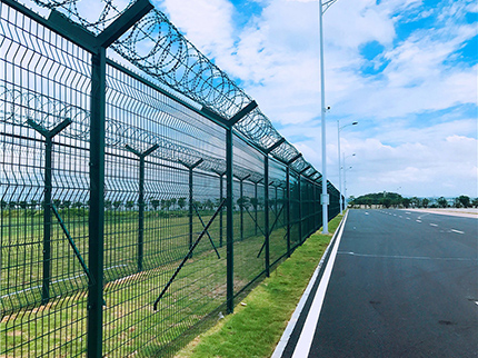 飛行區(qū)鋼筋網(wǎng)圍界網(wǎng)面是由直徑5mm的鋼筋排列成矩形網(wǎng)格點(diǎn)焊形成,相鄰橫筋間距不大于10cm,相鄰豎筋間距不大于5cm.每片鋼筋網(wǎng)片寬度不大于3m,用螺栓固定在事先埋設(shè)好的立柱上.為增加圍界的穩(wěn)定性,一般每30m左右增加一個(gè)斜撐.圍界上部50—60cm以30.一45.角向外傾斜,或設(shè)置滾筒形刺鐵絲網(wǎng)防止攀越。