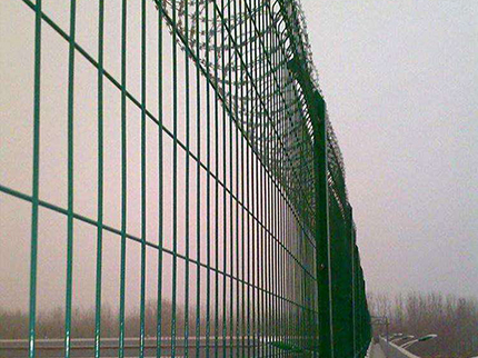 注:如果在機場隔離網頂部加裝刀片刺絲、刀片刺繩后又很好的增強了安全防護性能。采用電鍍、熱鍍、噴塑、浸塑等防腐形式,具有很好的抗老化、抗曬、耐候等特點。其產品造型美觀、花色多樣,既起到圍欄作用,又起到美化作用。由于具有安全性高、防攀爬能力好,網片連接方式采用特制SBS緊扣件,有效防止人為的破壞性拆卸,橫向四道折彎加強筋,使網面強度顯著增加。
